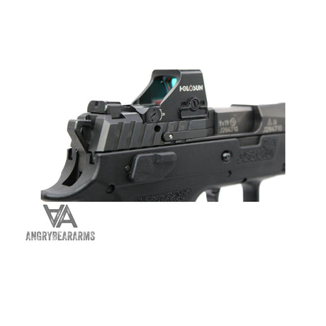 NOCTURNE slides accept RMSc and Holosun K-series footprint optics directly—no adapter plate required. Be aware that not all red dots share the same dimensions; oversized windows or housings can obscure a co-witness view of the irons. When pairing irons and optics, verify the optic footprint and size so the irons remain visible through the window. *