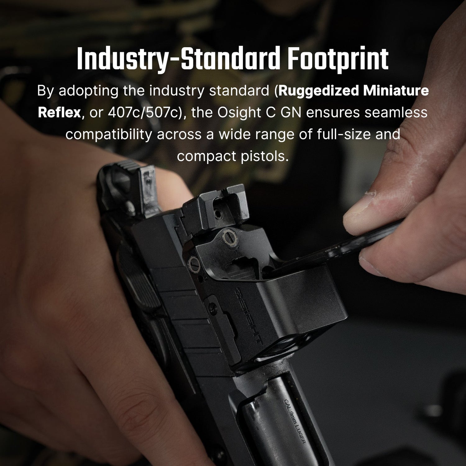 Osight C green is an open-emitter pistol red dot designed for fast target acquisition and simple everyday use. It uses the Trijicon RMR footprint. which makes it compatible with many modern pistols and mounting plates built around this industry standard.